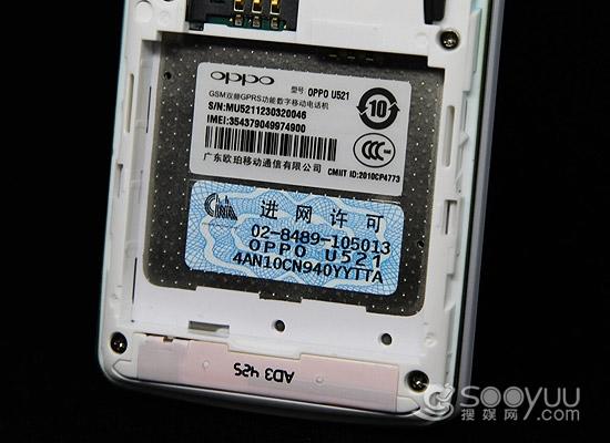 在手机的四个角都有一个小凸点,主要也是为了防止手机背面被划伤。在U521的电池后盖上还有一个印有OPPO字样的logo。