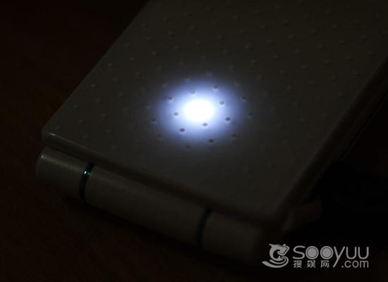 本次我们评测的U521手机为白色,整体采用的是翻盖设计。机身正面有很多小点做装饰,感觉立体感十足,而在正面顶部位置还有一个桃心样式的装饰,这里也是U521的一个呼吸灯,在充电和未接来电的时候会亮,还是挺漂亮的。