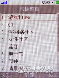 OPPO U521的用户界面和之前的产品并没有太大的区别,因为同样都是MTK平台的非智能系统,大家应该也是非常熟悉了。主界面两个功能键包括快捷和电话本,快捷里面可以进入女性社区等特色网络服务。