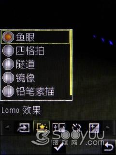 而在拍照方面,200万像素的能力表现平平,最大拍摄1600×1200分辨率的照片,但是本机支持拍照Lomo效果却令人眼前一亮,里面内置有鱼眼、四格拍、隧道、镜像、以及铅笔素描等风格,很有意思。