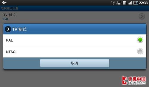 在设置选项中,我们看到了一个电视输出选项,在其中我们看到了TV制式的选择(PAL/NTSC),不过送测的只有一个P1000专用30针USB数据线,目前我们并不清楚如何让P1000连接到电视。