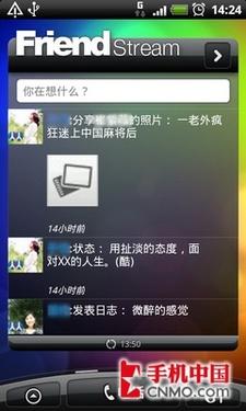 HTC渴望 HD内置了Friend Stream网络社交集成插件,并且全面支持开心网、人人网、新浪微博以及豆瓣这四大主流社交网站账号绑定。并且在绑定了相应的账号后,我们就可以通过Friend Stream桌面插件随时查看好友的最新消息。