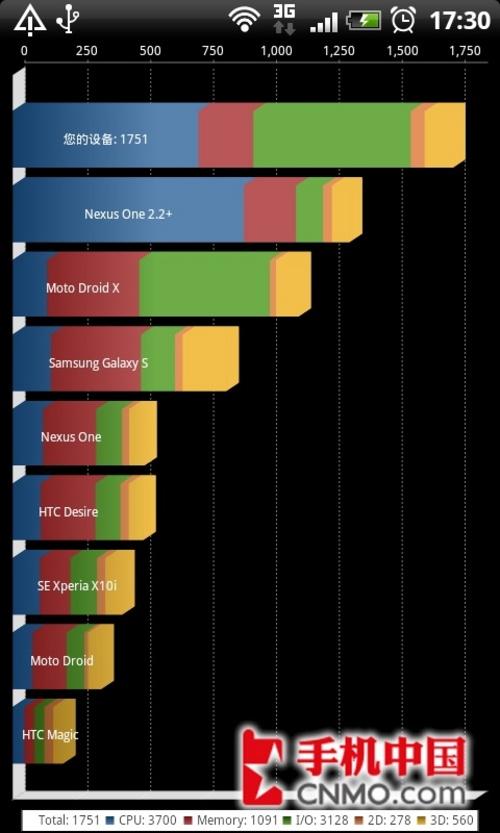 同时由于这款手机内置了1.5GB容量的机身储存空间、512MB的ROM以及高达768MB的运行内存,因此通过传统的Quadrant Advanced基准测试软件的测试结果可以看到,HTC渴望 HD在处理器、内存、I/O驱动部分的得分非常出色。而高通Snapdragon MSM 8255处理器芯片组另一个最大的改变,即是集成了Adreno 205图形处理器,因此这款手机3D运算能力同样非常出众。