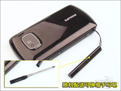 飞利浦X518随手机配送了可以伸缩的手写笔,方便习惯手写输入的用户。手写笔可以通过手机配备的挂绳孔与手机相连。