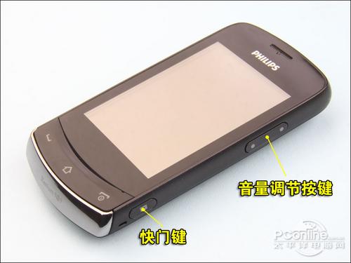 飞利浦X518侧面配备了音量调节按键及相机快门的物理按键。用户如需拍照只需轻按快门键即可进入拍摄界面。快门键旁边是该机的挂绳孔,用户可以通过这个孔连接手机挂饰或随机附送的手写笔。
