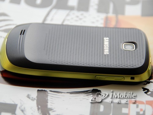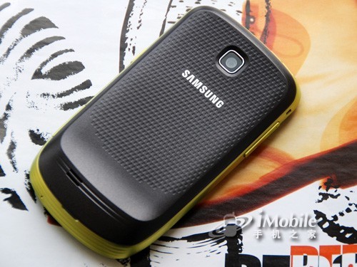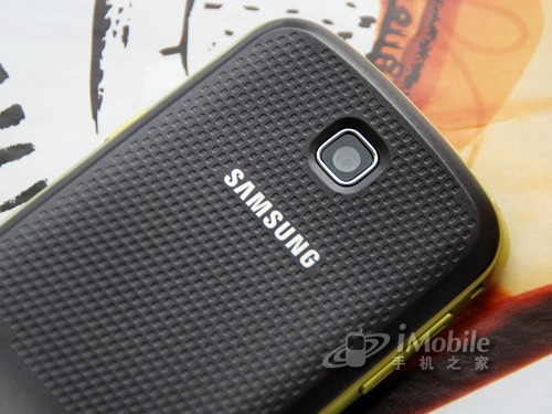 手机在背部中上端,采用了类似于雨点的设计,相信对于防滑防汗起到了一定功效吧!顶部位置是三星盖世S5570手机配置的摄像头,有效像素为320万,但遗憾的是没有配置LED补光灯。而稍向下走,我们又看见了三星LOGO。