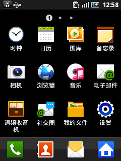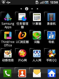 进入到功能菜单页,三星盖世S5570手机采用三行四列经典的十二宫格设计,同样通过点击功能键可以对图标进行任意的摆放。在下方,预置了四枚功能按键,分别是通话、联系人、信息、主页/功能页切换等常用功能。