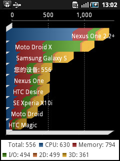首先,我们先对盖世S5570进行综合性能测试,对手机CPU、Memory、I/O、2D、3D进行跑分,最终得到556分的评定。从图中可以看到,手机性能介于Nexus One和GALAXY S之间,这样的成绩令人满意。