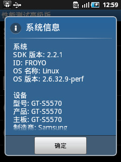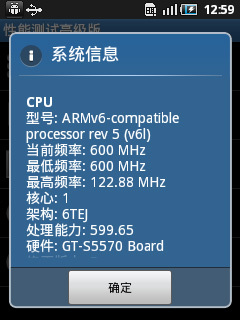 又进入手机性能评定的环节中,三星盖世S5570属于入门级智能手机,采用高通MSM7227处理器,运行频率为600MHz,同时手机图形处理芯片则采用Adreno 200。通过专业化的测试软件都手机进行了跑分测试,得到的结果还是令人满意的,下面我们就分开看一下。