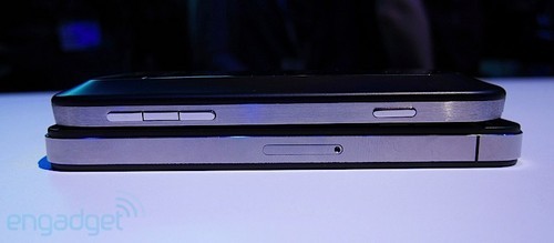黑莓Bold 9900(上)与iPhone 4(下)对比机身厚度