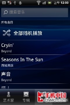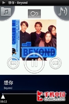 索尼爱立信ST15i的音乐界面与桌面的表现形式类似,都是采用了独特的四角触控界面,不过在音乐界面不能自定义边角的图标。界面中部就是三个宽大的圆形音乐控制按钮,当然,索尼爱立信ST15i同样支持歌曲的封面显示。