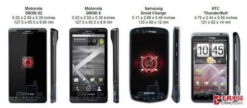 上面我们已经提到,Droid X2与Droid X的外观几乎完全相同(细节上有所改变),听筒以及屏幕下方的四个实体按键也同样保持了一贯的精致做工。从下面的外形对比表格中我们可以看大, Droid X2与Droid X的外观尺寸也没有任何的区别。与另外两款新机三星Droid Charge以及HTC ThunderBolt保持了相似的尺寸。