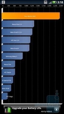 在使用Quadrant跑分成绩为2442分,与此前我们双核横向评测的比分对比来看,摩托罗拉Droid X2的跑分成绩不算突出,而AnTutu测试跑分为3382,落后于Optimus 2X和XOOM。