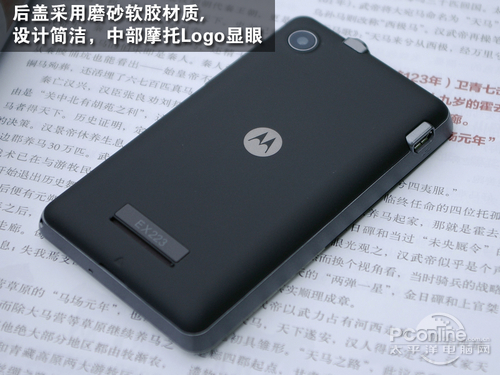 摩托罗拉后盖采用磨砂设计,从上往下依次是摄像头、银灰色MOTO LOGO和横条型扬声器。扬声器两侧有两个突起的小圆点,能保证手机在平放时声音不会被阻挡。