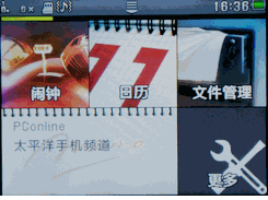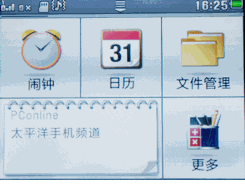 如果待机主屏已经让您感到惊艳的话,那接下来的菜单界面就堪称颠覆想象了。摩托罗拉EX223的UI设计非常统一,内置几个主题都是采用格子风格。菜单界面支持五个平行类别:基本功能、多媒体、通讯功能、互联网和Java应用,可用手指横向滑动切换类别。每个方格都可以长按弹出菜单更换小工具。同时,跟Android手机一样,在界面上方的任务通知栏有个下拉按钮,在这里用户可以快速设置手机情景模式、双模、连接、显示风格和主题等功能。