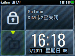 按电源键点亮屏幕后,映入眼帘的是一个四个方格,能显示运营商信息和时间日期。用手指轻轻将左侧锁形图标往下拉即可解锁屏幕,进入桌面。