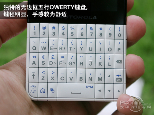 值得称道的是摩托罗拉为EX223设置了独立的数字按键,用户再也不用按SHIFT或ALT组合按键输入数字了。摩托罗拉EX223正面键盘每粒按键都有明显的凸起,按下声音清脆,手感不错。