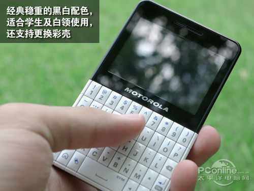 外观上,摩托罗拉EX223走的是简约路线。机身上半部是一块2.4英寸的触控屏幕,下半部是白色的五行式QWERTY键盘。