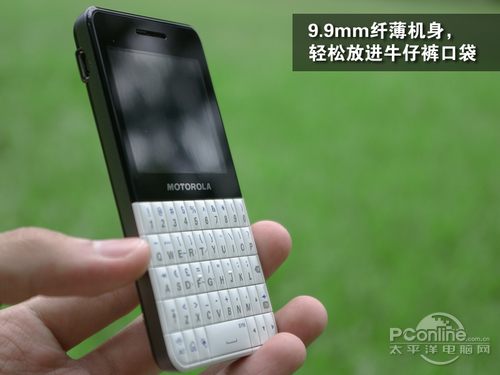 虽然笔者几天前才刚收集过摩托罗拉EX223的相关资讯,不过手机拿到手上的那一刻,还是有一种惊艳的感觉:纤薄的机身,经典的配色。摩托罗拉EX223采用方正简约的外形,机身厚度仅为9.9mm,拿在手里感觉非常轻薄。黑白配色的经典设计,让这款年轻人专属的社交手机也有了一丝摩托罗拉严谨的商务风格。