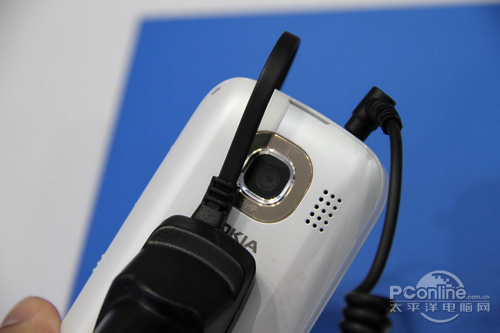 背面是200万像素摄像头和扬声器,摄像头用银色金属包围,四周没有发现闪光灯和AF字样,应该不支持自动对焦。不过诺基亚最近好几款机型都支持扩展景深技术,一定距离之外还是可以获得很不错的画质。
