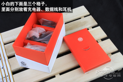 拿出手机,下面的三个格子里面分别放着手机的充电器、数据线和耳机,当然还有说明书、保修卡等。
