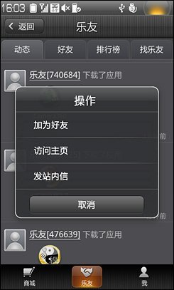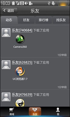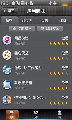 联想乐Phone上就有自家的APP Market了,在乐Phone S1上的应用商店更是进行了改进,支持SNS功能,成为了国内首个带SNS社交功能的APP Market。