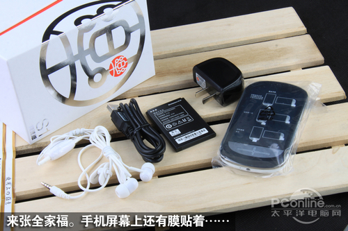 取出所有配件,先上张全家福。此次到达太平洋手机频道的是白色版的乐Phone S1,其面板上还贴着保护膜,不过,这膜很快就要没了。