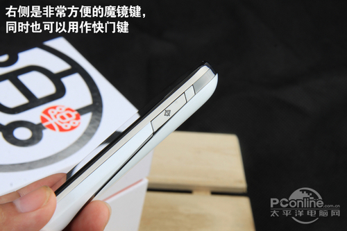 不看说明书的话,可能很多人都不知道右侧的按键是什么,因为好像无论怎么按都没有反应。其实它就是在联想乐Phone上已经出现了的“魔镜键”,这次又 再度出现在这款全新的机型身上。在看图、阅读电子书、浏览网页以及使用地图时,按住这个键同时倾斜机身,可以快速滚动画面。此外,在拍照模式下还可以充当 快门键使用。