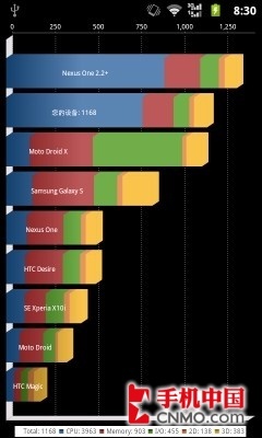 笔者使用基准测试软件对华为C8800进行测试,最终成绩稳定为1200分左右,这样的成绩已经超过了很多使用1GHz处理器的产品。当然,这更多是得益于全新的Android 2.3系统,可以说,华为C8800是将软硬件做到了极好的结合。在实际操控中,它的流畅表现也让我们满意。