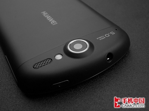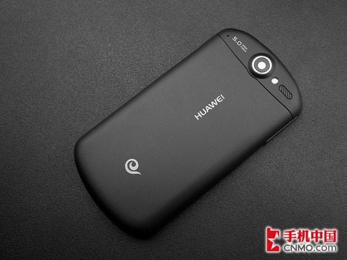 在机身背部,我们可以看到一个500万像素拍照镜头,在它的旁边也配有LED补光灯。在电池仓上,除了HUAWEI的品牌标识之外,中国电信天翼的LOGO也很显眼,这也是这款中国电信定制3G手机的身份象征。
