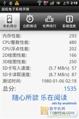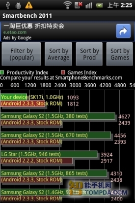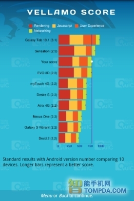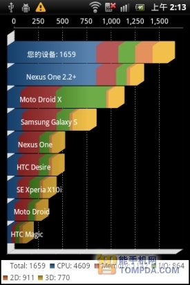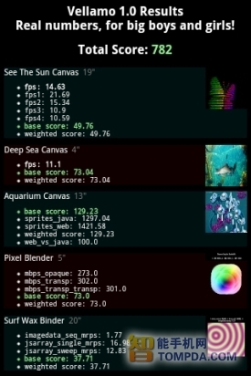 作为智能手机,性能当然是第一位的,我们在开篇也提到过了,索尼爱立信SK17i是罕见的拥有强悍配置的小个子机型,其配备有目前单核最强的处理器芯片组高 通MSM8255,主频达1GHz,图形芯片为Adreno 205。内存组合方面,RAM为512MB,ROM为1GB。除了主流的双核手机之外,索尼爱立信SK17i应该是难逢敌手,这点我们在跑分测试上也能够 看出。我们在跑分测试环节中多加入了一个新的测试软件:Vellamo,其主要针对浏览器HTML5、JS等性能进行测试。