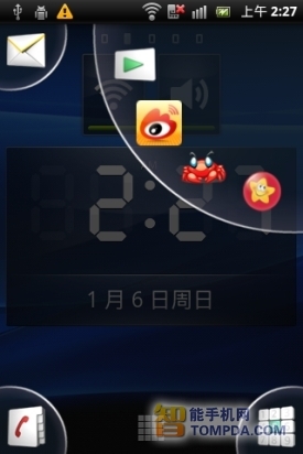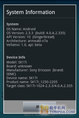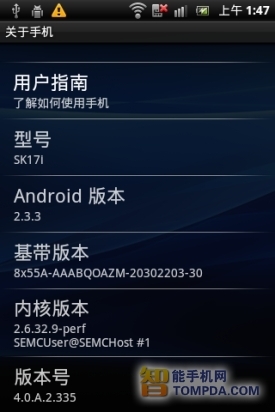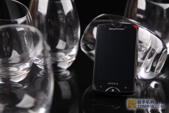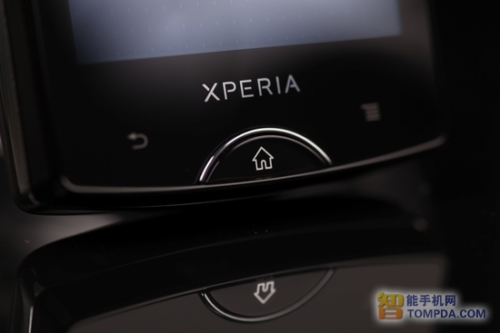 屏幕下方只有返回、菜单与主屏幕三个功能按键,其中主屏幕键为实体按键,被设计成圆弧形,类似的设计我们在LT15i上也看到过,其余两个为触感按键,按键上方还有标识SK17i血统的XPERIA标志。