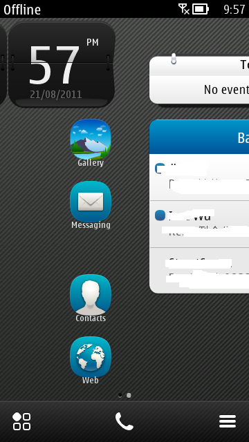 这里可以看到诺基亚在 Belle 抛弃了从最早 S60 以来的界面上方左信号右电量的布局,和其他包括时间、运营商和 Wi-Fi 信息等统统移到顶栏。