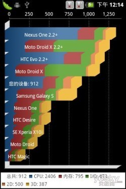 下面我们采用专业的手机跑分软件来对其进行测试,从下面实际的测试中我们也可以看到,该机的跑分成绩为912分,能带来不错的系统运行速度。而且其56.5分的图形跑分成绩也要比目前很多中高端手机产品高,对于一些较为主流的软件,基本能够流畅的运行。