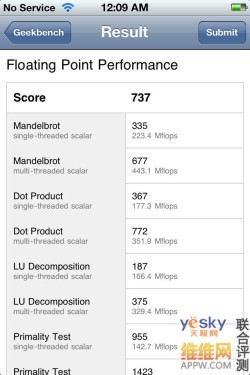 LinPack浮点测试成绩也增加了3倍多。虽然对于大部分iOS应用来说,浮点运算用的并不是很多,但是对于3D游戏来说,浮点运算性能是最重要的一个。