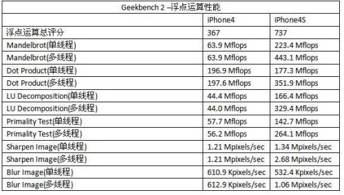 从下面表格可以看出,iPhone 4S的整数运算性能有大幅度提升,多线程下有接近2-3倍的提升。