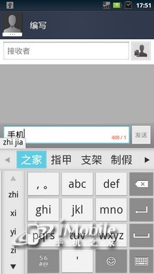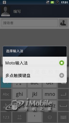 点击主界面下方的信息虚拟按键,进入摩托罗拉XT882的信息界面,摩托罗拉XT882内置有Moto输入法,Moto输入法支持全屏手写、全键盘与9键键盘三种模式,信息功能方面整体表现还是很不错的。