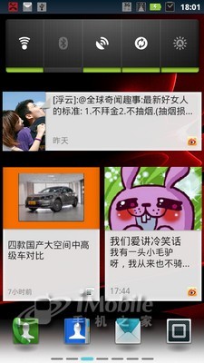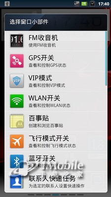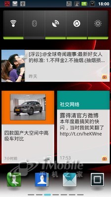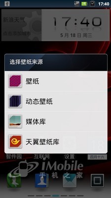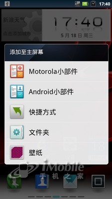 摩托罗拉XT882采用了Android智能操作系统,当然桌面小组件这个功能是不可能缺少的,长按主界面便会弹出主界面设置界面,在其中我们可以看到Motorola小组件、Android小组件和壁纸等功能的设置,在Motorola小组件中,摩托罗拉XT882为用户提供了WLAN开关、GPS开关、百事贴、社交网络等多种功能,绝对可以满足用户的DIY欲望。