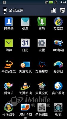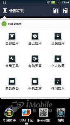 在主界面的下方有四个基础功能按键,从左往右分别是:通话功能、通讯录功能、信息功能和主菜单功能,进入摩托罗拉XT882的主菜单,我们可以看到摩托罗拉XT882采用了横列4个图标、纵列5个图标的排列方式,每个图标之间的间隙设计的比较大,不容易发生误操作,在主菜单的上方设计有一个分类功能按键,可以将在主菜单中呈现的应用功能进行分类,内置的分类栏目有全部应用、最近应用、已装应用、常用工具、电信天翼、个人收藏、商务办公和休闲娱乐,用户也可以自行添加新的分类,并且可以为分类设计新的图标。