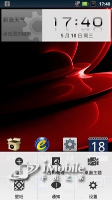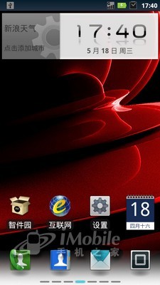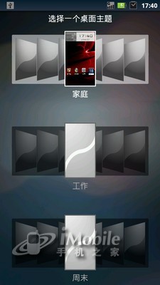 进入摩托罗拉XT882的主界面,新的界面呈现给人一种非常简洁干练的风格,摩托罗拉XT882为用户提供了七分屏设计,用户可以在七个分屏中随意摆放自己经常会用到的一些应用程序和小组件,并且摩托罗拉XT882还拥有桌面主题功能,为用户提供了三种选择,分别是:家庭、工作和周末,用户可以随心意去定制三个主题内每个分屏的内容,在工作时把工作需要的应用程序调出来,下班休闲时调出偏于娱乐功能的设置,这一点非常方便,也很人性化。