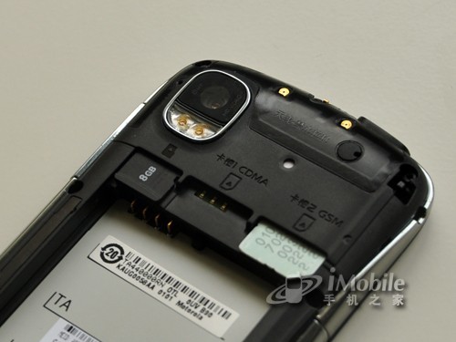 在摩托罗拉XT882的机身背面搭载了一枚800万像素摄像头,并且为其配备了双LED闪光灯,保证了它在弱光环境下的正常拍摄能力,在摄像头的右侧设计有中国电信天翼3G手机的LOGO,一朵祥云标志了摩托罗拉XT882天翼3G手机的身份,在摩托罗拉XT882机身背面的中央设计有标准的摩托罗拉LOGO,在机身背面的下方设计有一个网状的扬声器,声音效果表现的还是比较优秀的。