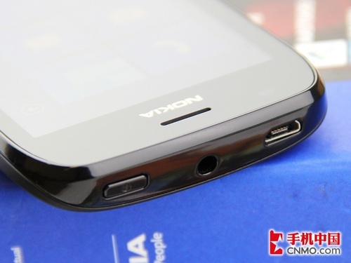 诺基亚Lumia 710机身边缘的按键及接口非常齐全,体现了诺基亚一直以来的人性化设计,在机身顶部,我们能够看到电源开关、3.5毫米通用耳机接口及Micro USB数据口。