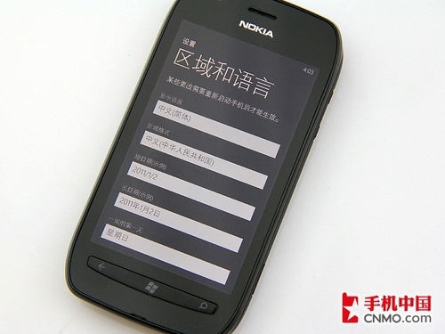 需要注意的是,在设置过区域后并经过重启后,诺基亚Lumia 710的解锁界面才能变成我们熟悉的中文。