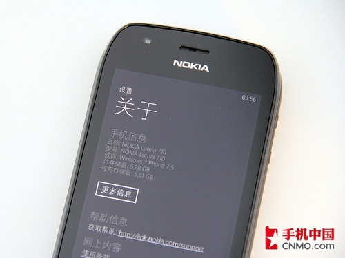 进入设置菜单的关于选项,我们能够查看手机的版本信息,我们看到,诺基亚Lumia 710采用了最新的Windows Phone Mango(7.5)版本系统,内置了8GB可存储空间。