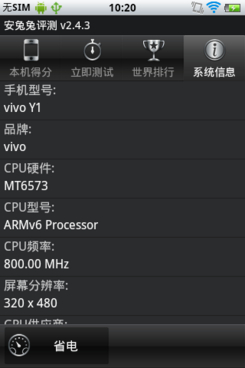 vivo Y1采用了800MHz的处理器,512MB的运行内存。不过和vivo V1不同的是,手机采用了MTK芯片,虽然在数值运算方面相对高通7227处理器较弱,但由于采用SGX531的GPU,3D性能还是不错的,运行愤怒的 小鸟、水果忍者等游戏毫无压力。