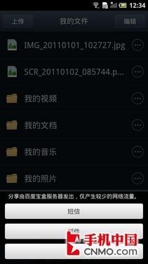 除了搜索之外,戴尔D43拥有的100GB超大容量免费云端存储空间也是其亮点所在。当绑定一个百度账号之后,通过手机预置的“百度宝盒”,我们可以轻松管理百度为我们提供的容量达100GB的云存储空间,上传、下载和管理都非常方便。另外,在本地文件浏览时,我们也可以直接选择分享到百度宝 盒。