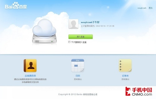 而在PC端,我们也可以用浏览器登陆百度宝盒(http://yiyun.baidu.com)来对存储在云空间的文件进行管理。PC端管理界面简洁明了,除了管理云端存储的文件,也可以管理通讯录。界面还提示,未来日历和记事本也可以云同步。