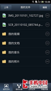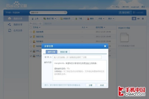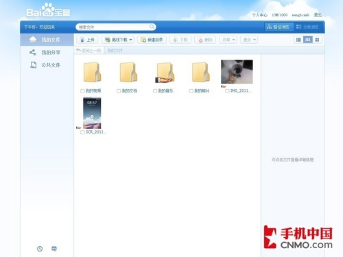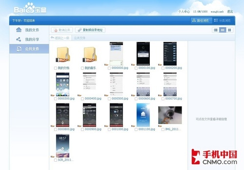 在PC端的管理界面中,百度宝盒共有三个分类,分别是我的文件、我的分享、公共文件。其中,我的文件就是用户存储在云端的文件,用户只有登陆宝盒才能访问,其他人无法查看。