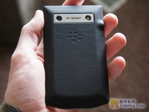 另外,皮革材质后壳上有纹理设计,还能起到一定的防滑作用。后壳上方有金属条设计,印有P9981的型号,左侧是500万像素摄像头,右侧则是闪光灯,金属条下方是黑莓Logo的浮雕式设计。