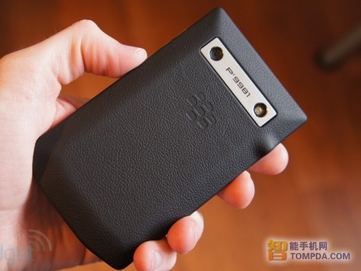 黑莓P9981的后壳有坡度式设计,在一定程度上起到了视觉收缩的作用,这样看起来,这款手机还不是很庞大。